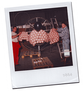 C’est grâce à l’aide enthousiaste de bons copains (voir à gauche) qu’ont pu débuter les montages de décorations en ballons. Les prémices d’internet nous faisaient découvrir ce qui se développait avec succès de l’autre côté de l’Atlantique. Mais tout cela se passait avant les Youtube et Pinterest d’aujourd’hui : les techniques utilisées restaient bien secrètes… Et nous devions donc inventer nous-mêmes comment construire ces premières guirlandes de ballons (voir à droite)… dont nous étions très fiers !